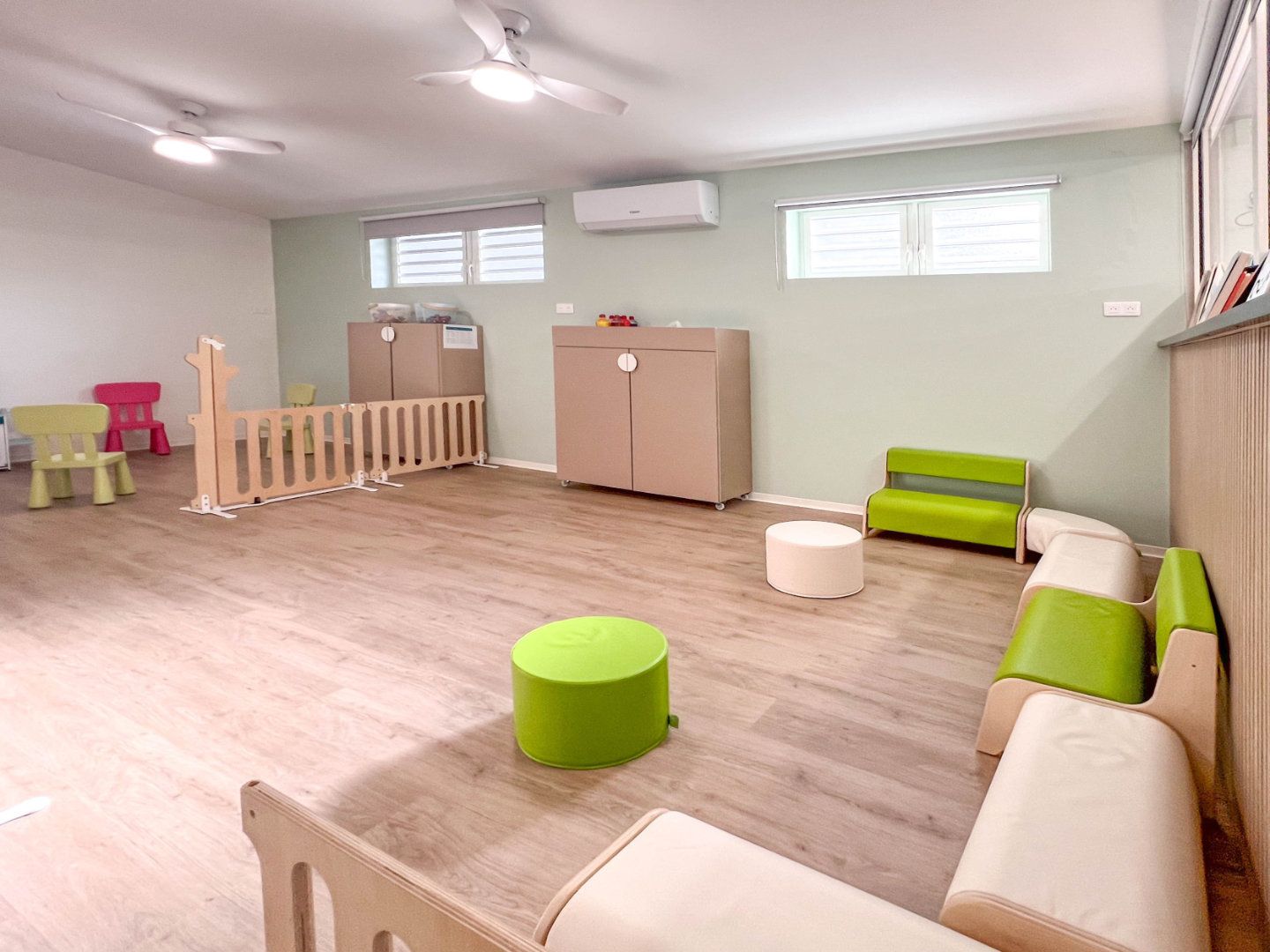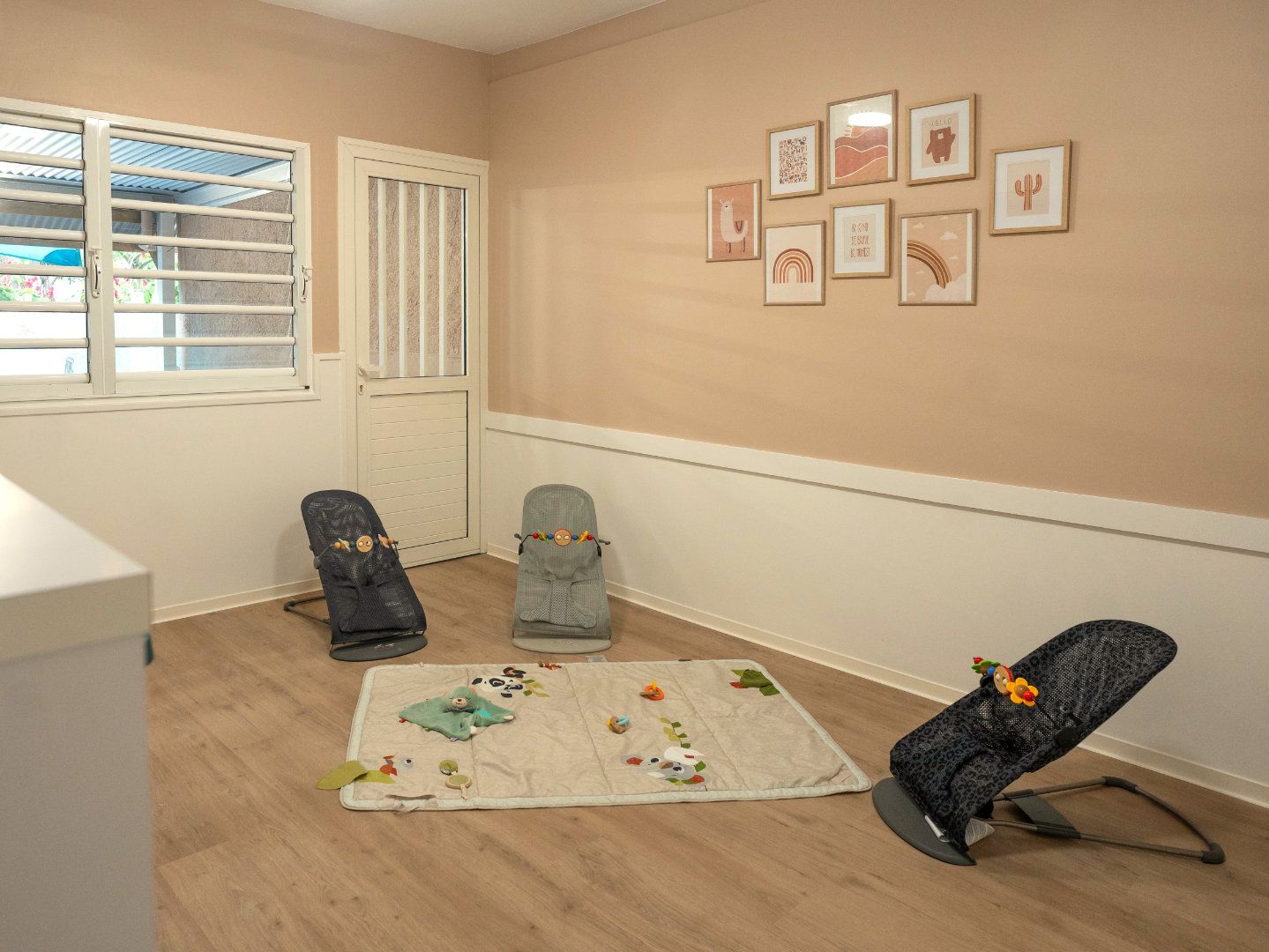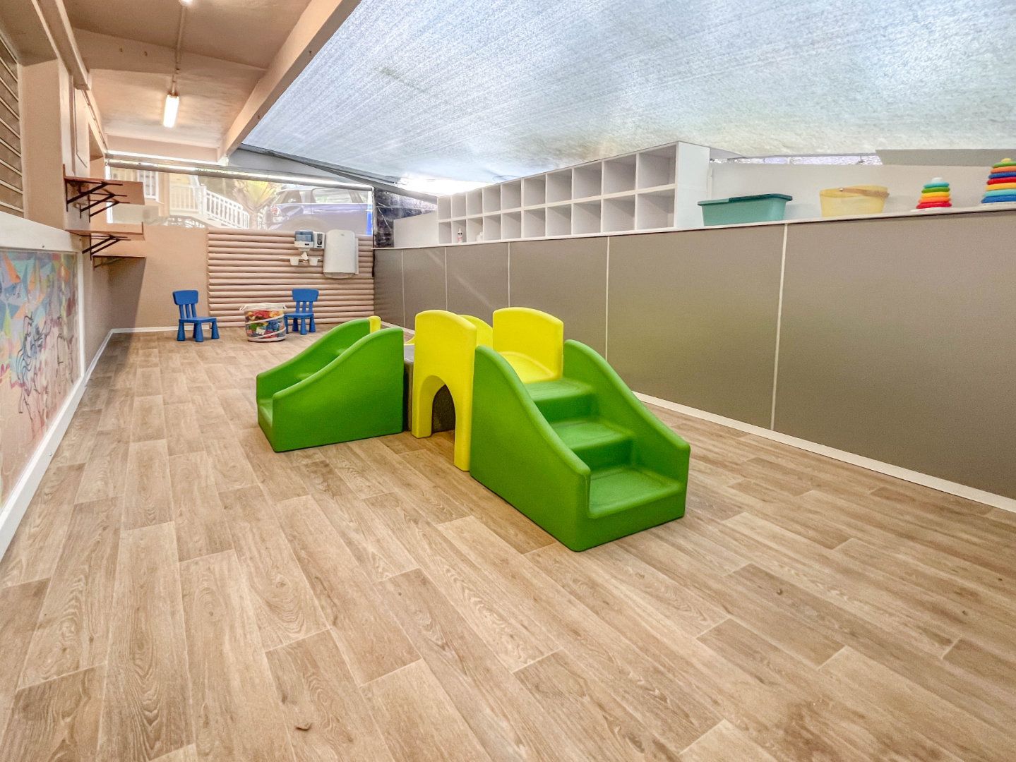 Cet espace est spécialement aménagé en sol souple épais afin de pratiquer des activités de baby gym en toute sécurité.